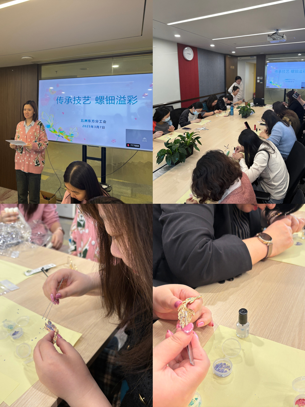 ??為進(jìn)一步弘揚(yáng)中華民族優(yōu)秀傳統(tǒng)文化,感受非遺物質(zhì)文化遺產(chǎn)的獨(dú)特魅力,五洲東方女職工開展了“傳承技藝,螺鈿溢彩”主題活動(dòng)。在充分了解螺鈿的歷史淵源、文化內(nèi)涵和制作工藝,欣賞了獨(dú)特精美的螺鈿作品后,女職工們迫不及待動(dòng)手體驗(yàn),選料、打磨、鑲嵌,薄薄的蚌殼在巧手打磨下呈現(xiàn)出絢麗的光彩,一件件獨(dú)一無二的螺鈿作品在大家手中孕育而生。大家相互交流制作心得,臉上洋溢著喜悅,心中對(duì)非遺文化的熱愛與保護(hù)意識(shí)也悄然滋長。