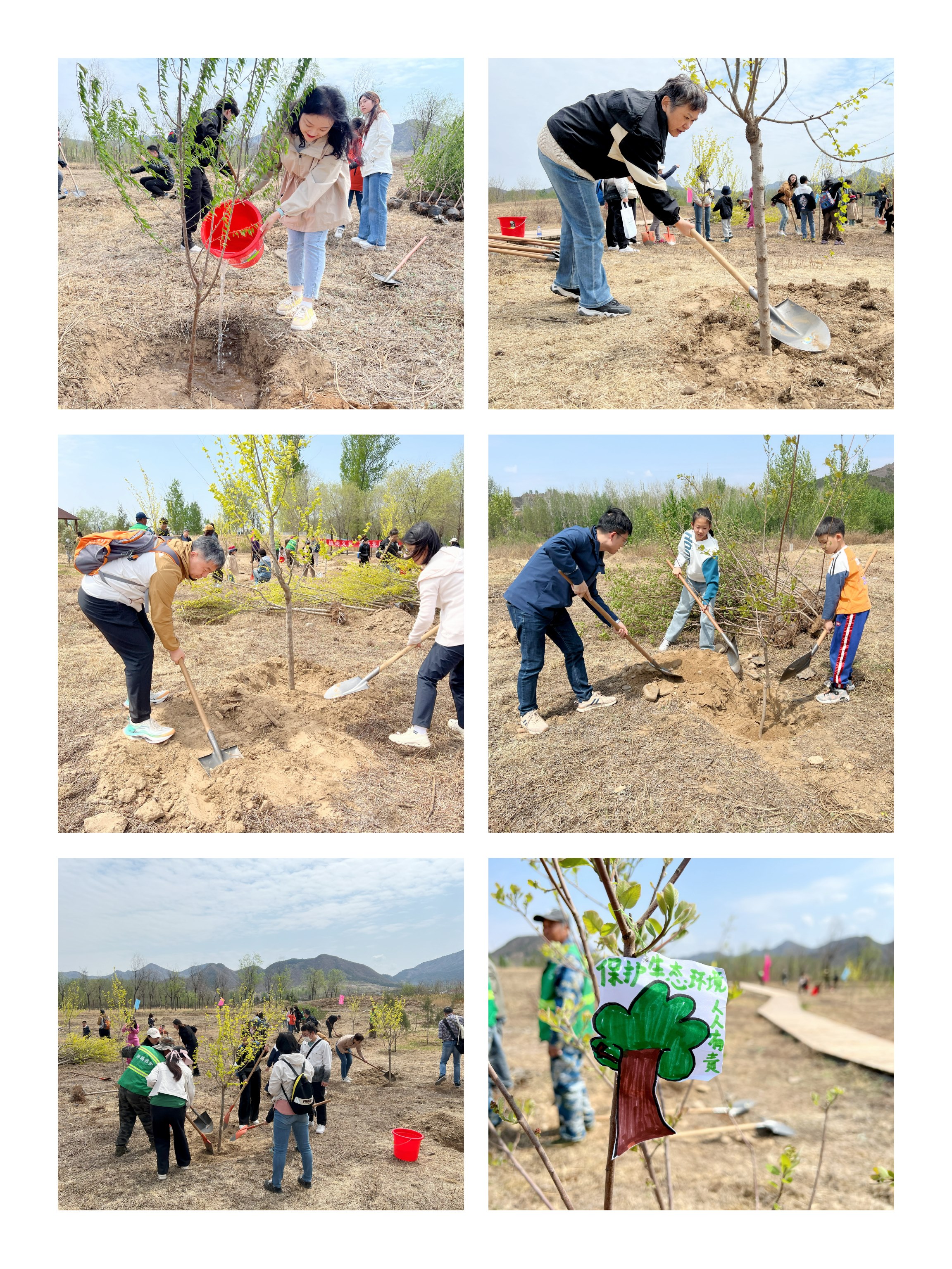 ??京郊大地,春意盎然。大家抵達(dá)密云太師屯“互聯(lián)網(wǎng)+全民義務(wù)植樹”基地后,立即熱情高漲地投入到植樹勞動中,揮鍬挖坑、扶正樹苗、培實(shí)浮土、提桶澆水,分工協(xié)作、干勁十足,共計(jì)種植金葉榆、黃櫨、山桃等樹苗130余株。經(jīng)過一番辛勤的勞動,植樹基地很快又增添了一片新綠,點(diǎn)綴了朵朵桃紅,呈現(xiàn)出一派春和景明、生機(jī)勃勃的喜人景象。